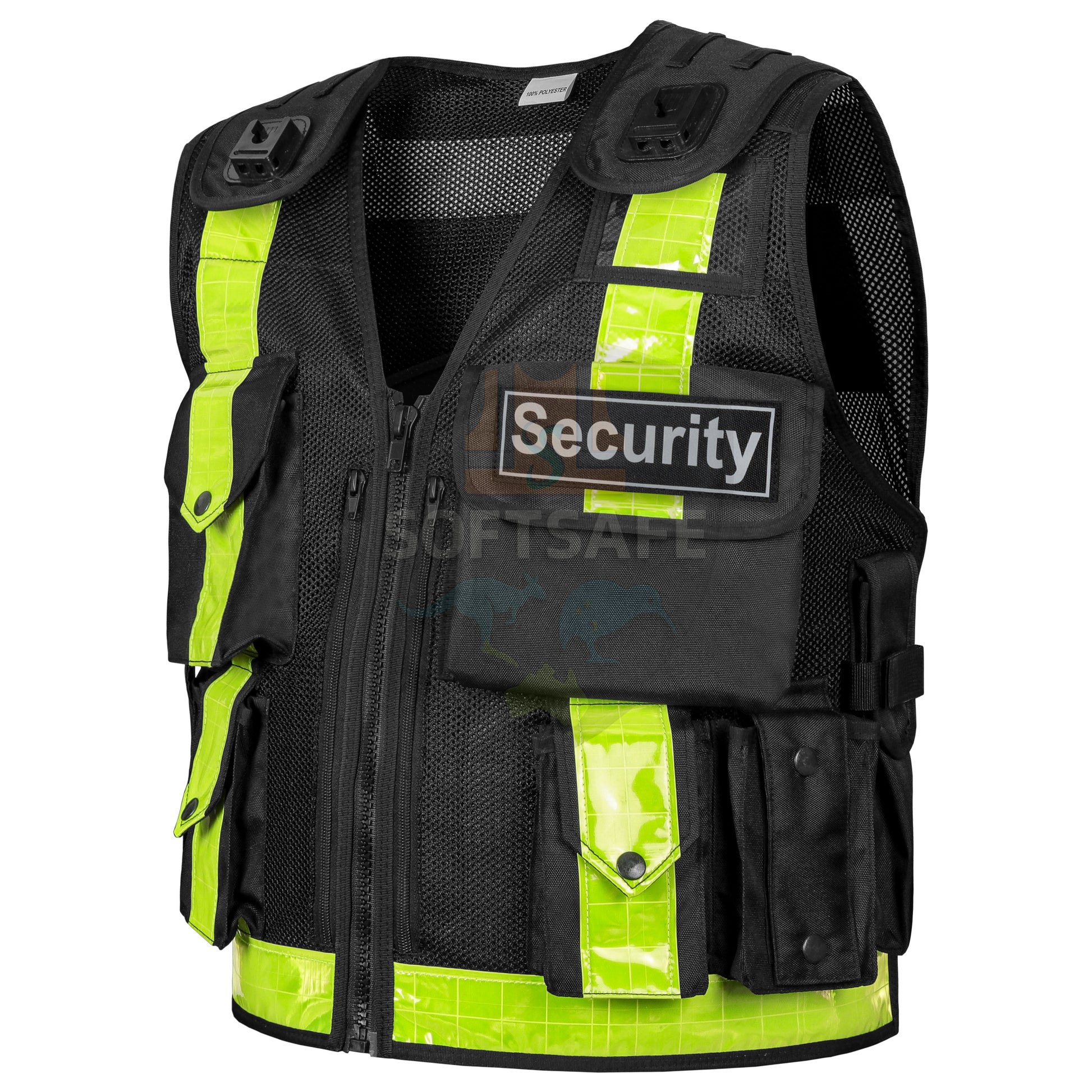 SOFTSAFE Black Security Vest – High-Visibility Mesh Safety Vest with Removable Patches & Multi-Pockets